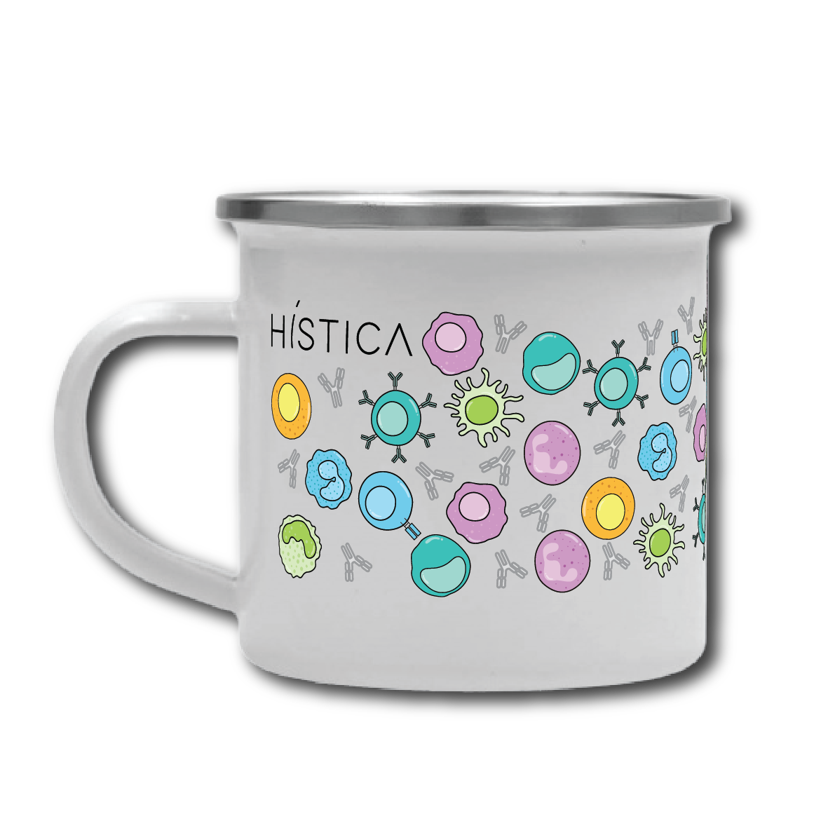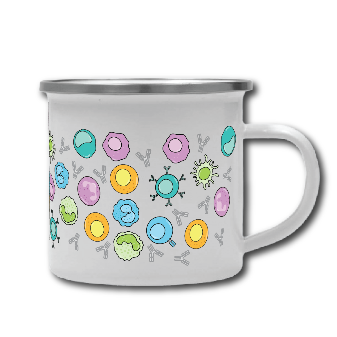 Jarro de metal esmaltado color blanco estampado con el diseño de las células inmunes.